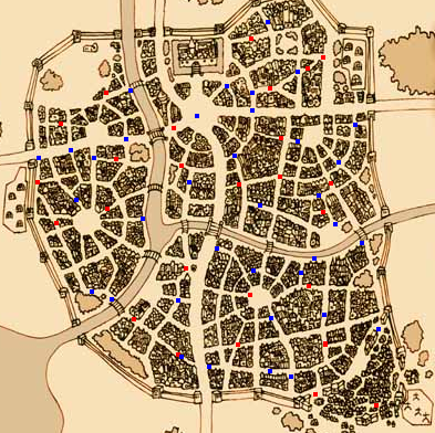 【マスター】:ああ、地図はコレだ。担当のヤツが事件の場所だけ印つけてるみたいだな。青は眩暈がしたやつ、赤は気絶したやつだ>アンディ